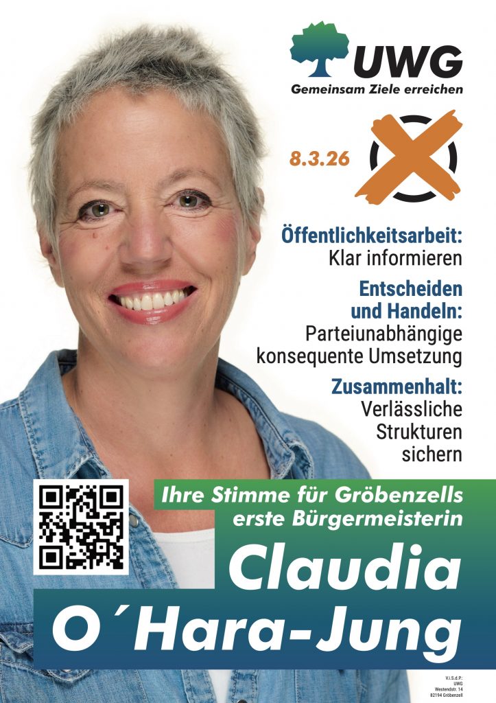 Ich, Claudia O’Hara-Jung, bitte Sie dafür um Ihre Stimme am 8.März – für mich als Gröbenzells erste Bürgermeisterin und für mein Team der UWG.